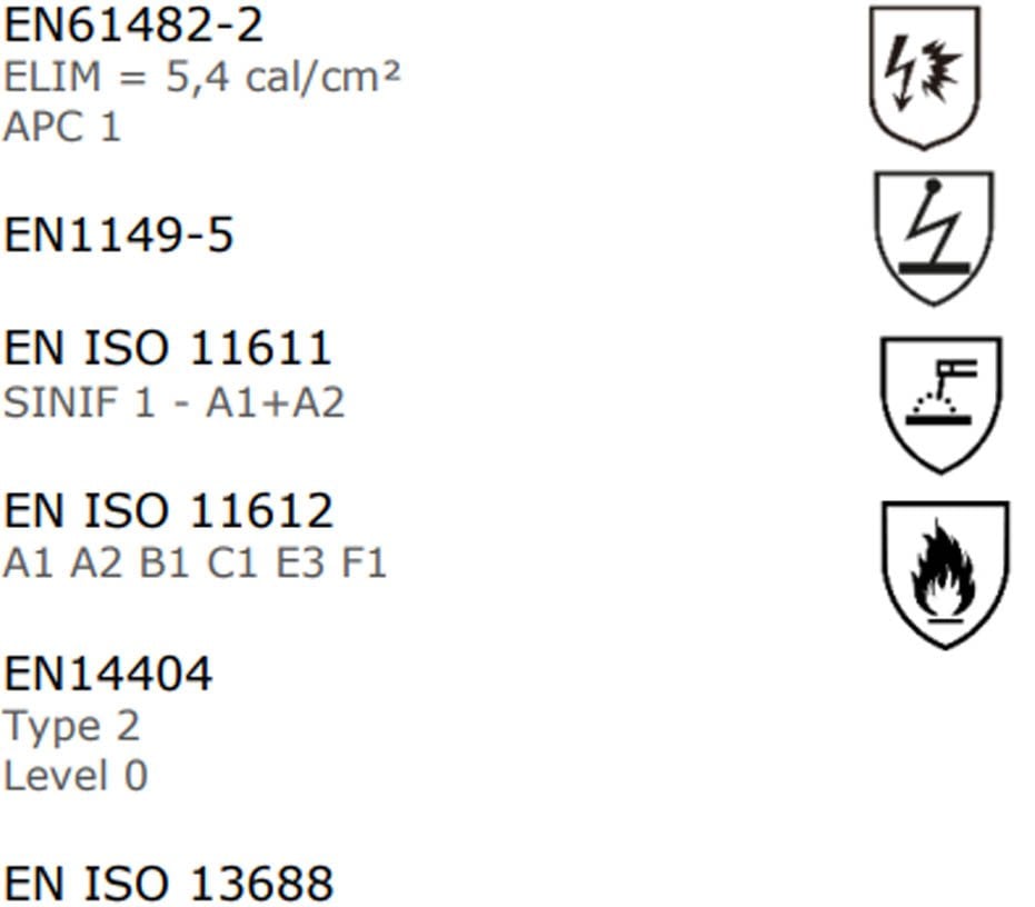 - EN ISO 11612, EN 1149-5, EN 61482-2 ve diğer güvenlik