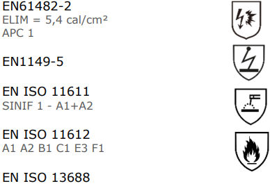 - %99 pamuk, %1 antistatik fiber içeren 320 g/m² twill kumaş ile üretilmiştir.